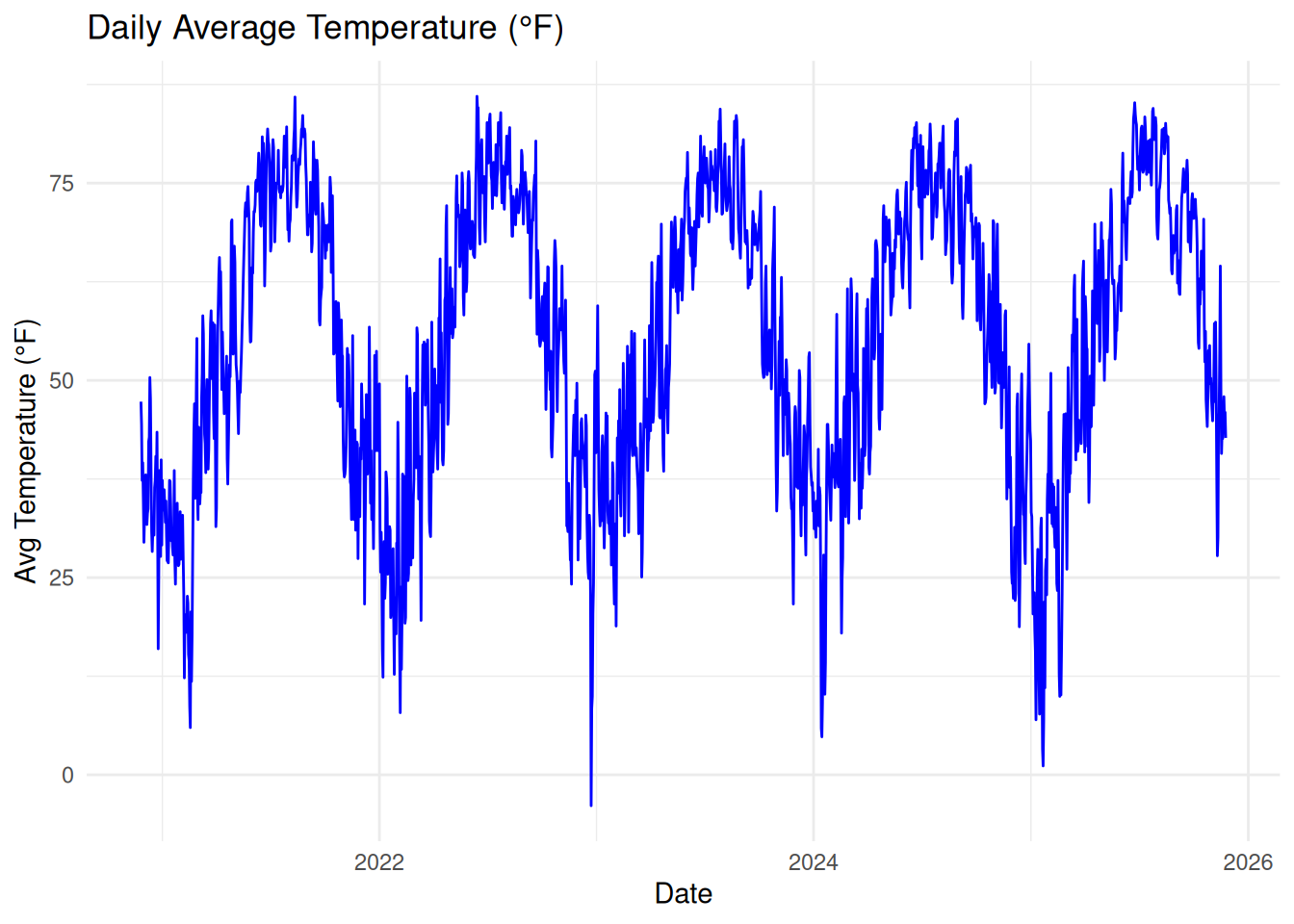 p1 <-ggplot(indy_weather, aes(x = date, y = temp_avg_f)) +geom_line(color ="blue") +labs(title ="Daily Average Temperature (°F)",x ="Date", y ="Avg Temperature (°F)") +theme_minimal()