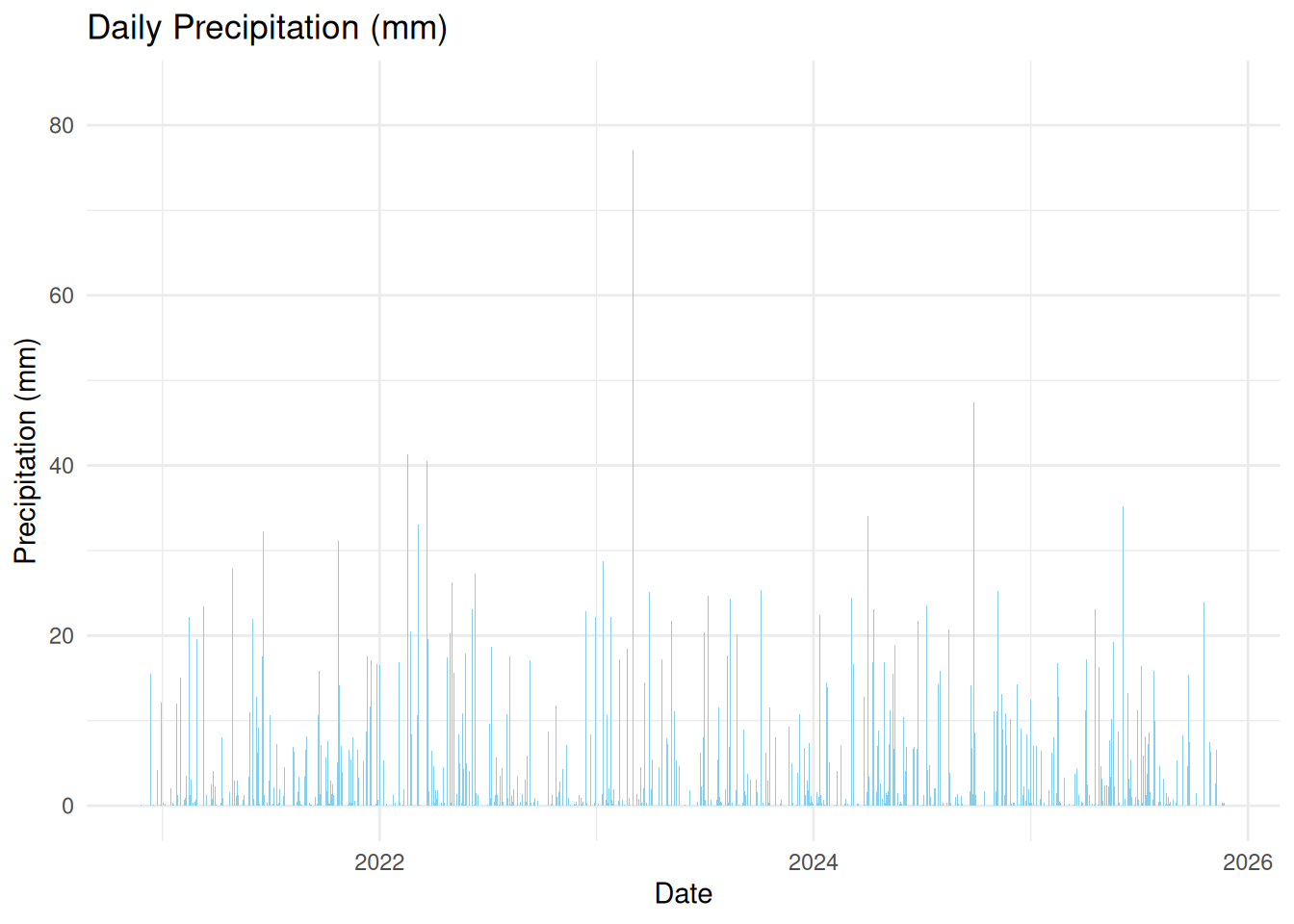 p2 <-ggplot(indy_weather, aes(x = date, y = precipitation)) +geom_bar(stat ="identity", fill ="skyblue") +labs(title ="Daily Precipitation (mm)",x ="Date", y ="Precipitation (mm)") +theme_minimal()