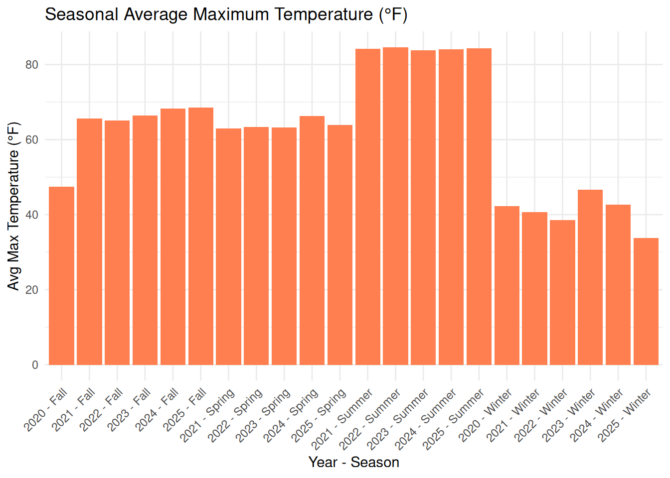 p3 <-ggplot(seasonal_summary, aes(x =interaction(year, season, sep =" - "), y = avg_max_temp)) +geom_col(fill ="coral") +labs(title ="Seasonal Average Maximum Temperature (°F)",x ="Year - Season", y ="Avg Max Temperature (°F)") +theme_minimal() +theme(axis.text.x =element_text(angle =45, hjust =1))